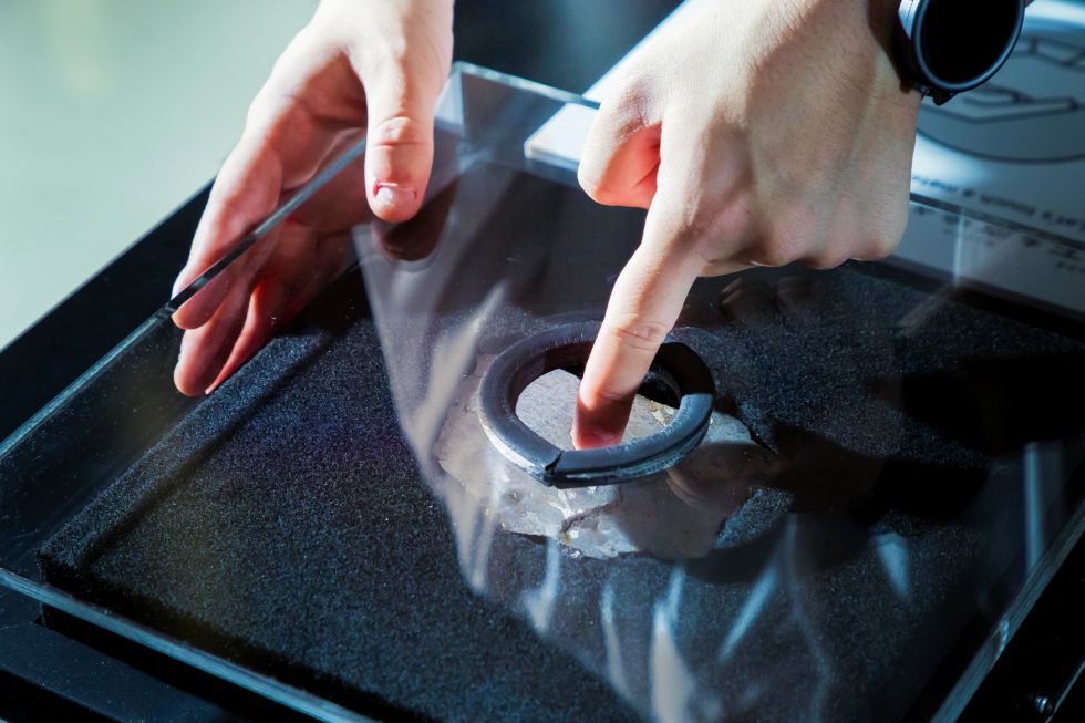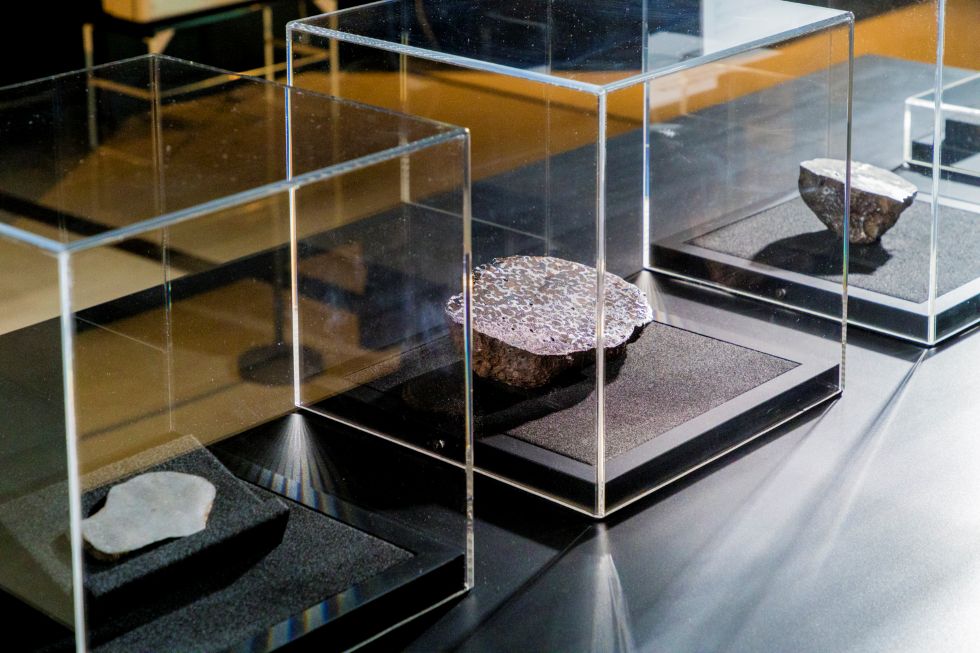 隕石展示 隕石とは、宇宙から地球に飛来してきた岩石で、地球以外の天体のかけらを地球上で直接手に取って調べることができる貴重な試料です。 隕石は含まれる金属鉄と岩石(ケイ酸塩鉱物)の割合の違いから、「石質隕石」、「石鉄隕石」、「鉄隕石(隕鉄ともいう)」の3つに分けられます。このコーナーではその3種類の隕石を展示中です。 また、直接さわることができる隕石も設置しています。